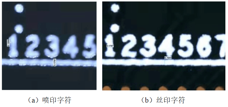 另外,由于噴印油墨極低粘度的特點,在油墨組分上同絲印油墨差異很大,表現在PCB基材上的白度和立體感往往會比現有絲印油墨要顯得弱一些,有時就會覺得相同厚度和大小字符下絲印字符可能會更清楚,但是由于噴印墨水的流平性會好一些,所以噴印字符會覺得更光滑點。這里應該堅持以IPC字符標準——目視清晰可辨——為依據來判斷字符質量是否符合要求,不能強求噴印和絲印完全一致。
